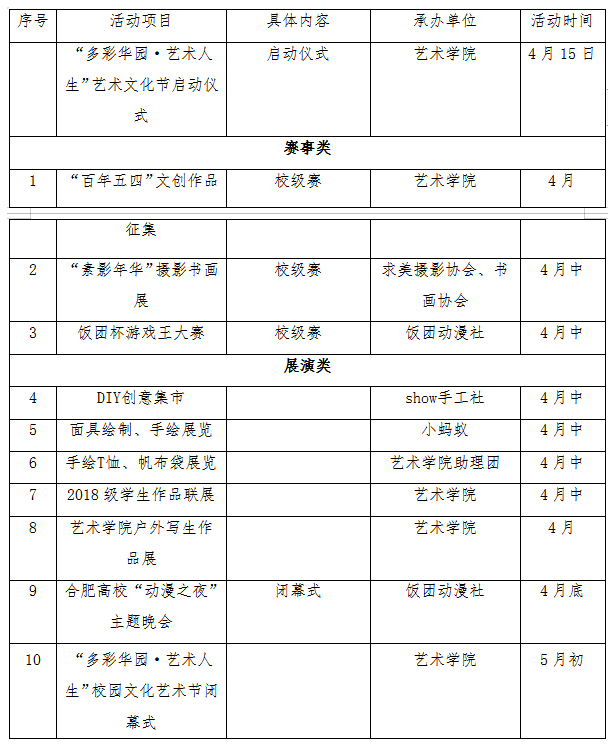二、活動時間 2019年4月 活動承辦:藝術(shù)學(xué)院團(tuán)總支 活動協(xié)辦:藝術(shù)學(xué)院學(xué)生會、藝術(shù)學(xué)院助理團(tuán)、手工社、小螞蟻協(xié)會、書畫協(xié)會、攝影協(xié)會、論智桌游社、排球社、動漫飯團(tuán)社。 (一)4月18日中午12:00(如遇天氣原因?qū)⒄{(diào)整日期)于翰林廣場啟動“活動主題·藝術(shù)人生”校園文化藝術(shù)節(jié)啟動儀式。二級學(xué)院由行政副院長領(lǐng)隊,組織團(tuán)總支書記,各級各類學(xué)生組織骨干代表、學(xué)生代表5人參與啟動儀式;校級學(xué)生組織由校團(tuán)委統(tǒng)一組織。各單位提前20分鐘到達(dá)廣場,按照指定位置列隊,著裝要求以簡單大方為主,佩戴團(tuán)徽。 (二)各學(xué)院、各組織鼓勵并動員學(xué)生參與“多彩華園·藝術(shù)人生”文化節(jié)系列活動,通過文化藝術(shù)節(jié)系列活動培養(yǎng)學(xué)生藝術(shù)審美,豐富學(xué)生的藝術(shù)生活?;顒泳唧w安排如下: (一) 關(guān)注微信公眾號“安徽新華學(xué)院團(tuán)委”,點(diǎn)擊菜單欄“PU口袋校園”注冊并登陸,首頁找到活動,點(diǎn)擊“報名”,參與活動。 (一)校園文化月活動作為高校校園文化內(nèi)涵的一種外在表現(xiàn)形式,是展示學(xué)院師生良好精神風(fēng)貌的重要窗口,對于進(jìn)一步激發(fā)廣大師生工作學(xué)習(xí)的積極性和主動性,對于創(chuàng)造和諧、求知、進(jìn)步的育人環(huán)境,具有十分重要的意義。 (二)藝術(shù)學(xué)院團(tuán)總支、學(xué)生會要發(fā)揮骨干作用,強(qiáng)化措施,組織得力,注重實效。在開展活動時要注意調(diào)動學(xué)生的積極性、創(chuàng)造性,增強(qiáng)活動的實效性,擴(kuò)大學(xué)生的參與面,爭取使每位同學(xué)都參加一項活動,把本次文化月辦成學(xué)生參與面廣、活動多、質(zhì)量高的一屆盛會,讓學(xué)生真正在活動中施其所長,發(fā)展個性,使青年學(xué)生在活動中得到教育和熏陶,不斷擴(kuò)大校園主流文化的影響力。 (三)各項活動要圍繞“多彩華園·藝術(shù)人生”的主題,抓住有利契機(jī),圍繞學(xué)生成長、成才精心設(shè)計,認(rèn)真組織落實,力求精品。所有參展作品應(yīng)適合當(dāng)代大學(xué)生的基本特征,體現(xiàn)當(dāng)代青春風(fēng)采。參賽所需用品自備。 (四)各二級學(xué)院積極鼓勵并動員學(xué)生參與“多彩華園·藝術(shù)人生”文化節(jié)系列活動,立足文明校園建設(shè),引導(dǎo)學(xué)生向上生活,躍動青春。各社團(tuán)結(jié)合主題開展活動,活動結(jié)束將于閉幕式進(jìn)行相關(guān)獲獎表彰。