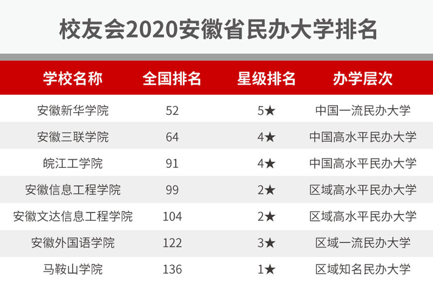 報告顯示,在最新艾瑞深中國校友會網(wǎng)2020安徽民辦大學(xué)排名中,安徽新華學(xué)院綜合實(shí)力最強(qiáng),雄居校友會2020安徽民辦大學(xué)排行榜榜首,榮膺2020中國五星級民辦大學(xué)(5★)美譽(yù),安徽新華學(xué)院連續(xù)六年問鼎該榜單第一,連續(xù)三年穩(wěn)居中國一流民辦大學(xué)行列。