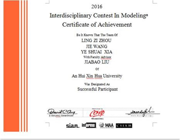 美國(國際)大學(xué)生數(shù)學(xué)建模競賽與交叉學(xué)科數(shù)學(xué)建模競賽(MCM/ICM)官方網(wǎng)站揭曉了2016年美國大學(xué)生數(shù)學(xué)建模競賽結(jié)果。安徽新華學(xué)院本科生組成的2支參賽隊伍首次參加此項國際賽事,經(jīng)過四天四夜(1月29日-2月2日)96個小時的緊張奮戰(zhàn),由大學(xué)生數(shù)學(xué)建模協(xié)會成員組建的兩支隊伍:王杰、謝杰、陽升鵬和夏業(yè)帥、周玲子、王杰(重名)等同學(xué)最終從12446支全球參賽中脫穎而出,獲得兩個國際三等獎的好成績。