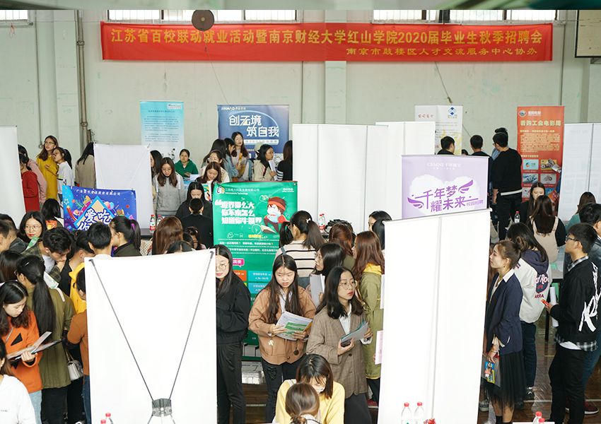 10月30日上午,江蘇省百校聯(lián)動(dòng)就業(yè)活動(dòng)暨南京財(cái)經(jīng)大學(xué)紅山學(xué)院2020屆畢業(yè)生秋季招聘會(huì)在南京財(cái)經(jīng)大學(xué)紅山學(xué)院福建路校區(qū)體育館舉行。途牛信息科技、招商銀行南京分行、南京蘇寧云財(cái)信息技術(shù)有限公司、浙商證券、南京萬得資訊等近百家用人單位現(xiàn)場(chǎng)招聘,涉及金融、財(cái)會(huì)、銷售、管理等多個(gè)崗位,基本涵蓋紅山學(xué)院全部專業(yè)。